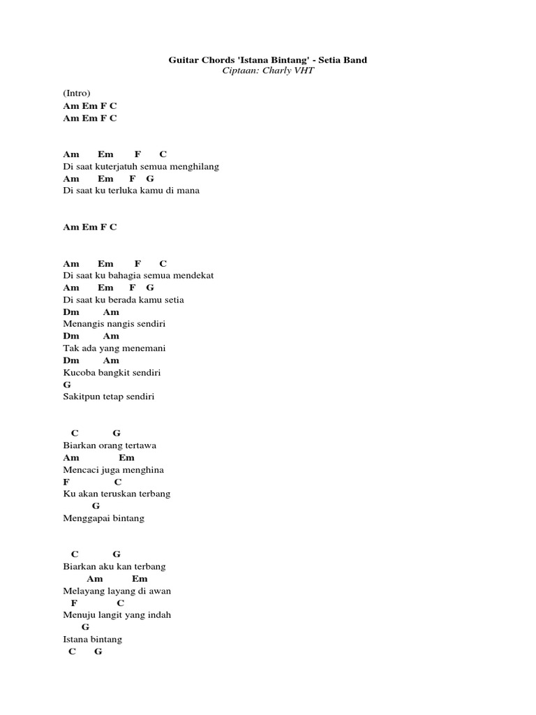 Inilah chord gitar dan lirik lagu 'istana bintang' punya setia band. Capo on 1st intro c g am e7 am d7 dm g verse 1 am em f g em am sendiri, sendiri ku diam, diam dan merenung dm e7 am g merenungkan jalan yang kan membawaku pergi f g em am pergi tuk menjauh, menjauh darimu dm f em a7 dm darimu yang mulai berhenti, berhenti mencoba fm em. Anda bisa mulai mempelajari gitar dengan mempelajari beberapa skala pentatonik, teori musik, akor. Lagu ini meluncurpada tahun 2014 silam. Menangis nangis sendiri tak ada yang menemani kucoba bangkit sendiri sakitpun tetap sendiri.